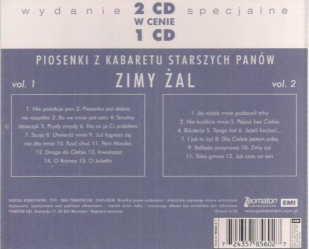 Zawiera: Zawiera: 1 CD Nie pożałuje pan - Magda Ume ; Rozmowa telefoniczna - Magda Umer i Jeremi Przybora ; Piosenka jest dobra na wszystko - Zespół ; Rozmowa telefoniczna - Magda Umer i Jeremi Przybora ; Bo we mnie jest seks - Adrianna Biedrzyńska i Zbigniew Zamachowski ; Rozmowa telefoniczna - Magda Umer i Jeremi Przybora ; Smutny deszczyk - Janusz Józefowicz ; Prysły zmysły - Maria Pakulnis ; No co ja Ci zrobiłem - Piotr Machalica ; Szuja - Ewa Dałkowska ; Rozmowa telefoniczna - Magda Umer i Jeremi Przybora ; Utwierdź mnie - Adrianna Biedrzyńska ; Już kąpiesz się nie dla mnie - Zbigniew Zamachowski i Magda Umer ; Rozmowa telefoniczna - Magda Umer i Jeremi Przybora ; Rzuć chuć - Adrianna Biedrzyńska, Ewa Dałkowska, Maria Pakulnis ; Rozmowa telefoniczna - Magda Umer i Jeremi Przybora ; Pani Monika - Piotr Machalica ; Droga do Ciebie - Janusz Józefowicz ; Inwokacja - Zbigniew Zamachowski ; Rozmowa telefoniczna - Magda Umer i Jeremi Przybora ; O Romeo - Magda Umer ; Rozmowa telefoniczna - Magda Umer i Jeremi Przybora ; O Juletto - Jeremi Przybora ; Rozmowa telefoniczna - Magda Umer i Jeremi Przybora.