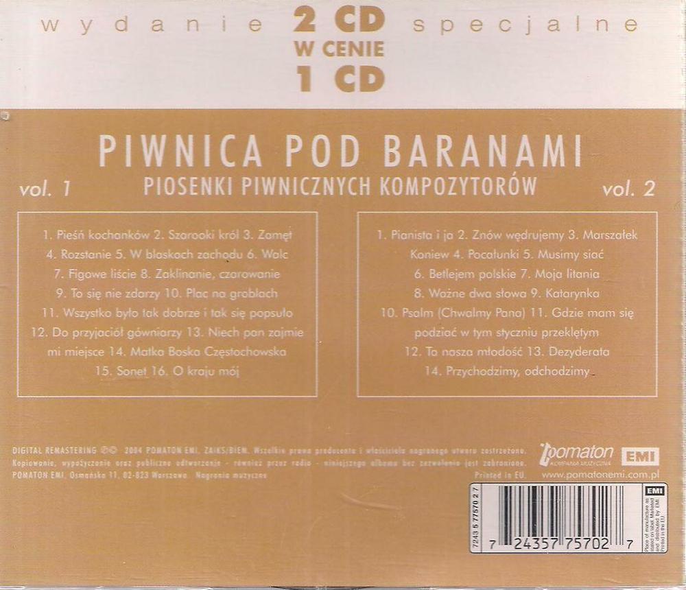 Piwnica pod Baranami : Piosenki piwnicznych kompozytorów. - Warszawa : Pomaton EMI, 2004. - 2 płyty audio (CD) : zapis cyfrowy, stereo ; 12 cm.