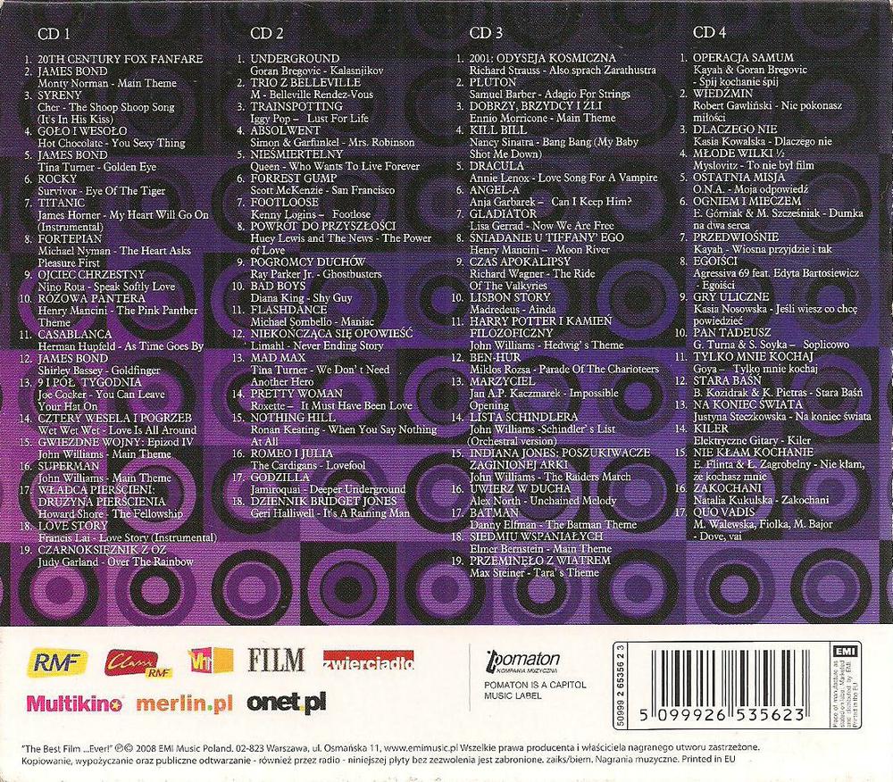 Zawiera: Zawiera: CD 3 - Richard Strauss - Also Sprach Zarathustra ; Samuel Barber - Adagio For Strings ; Ennio Morricone - Main Theme ; Nancy Sinatra - Bang Bang ( My Baby Shot Me Down ) ; Annie Lenox - Love Song For A Vampire ; Anja Garbarek - Can I Keep Him ; Lisa Gerrad - Now We Are Free ; Henry Mancini i jego orkiestrę - Moon River ; Richard Wagner - The Ride Of The Valkyries ; Madredeus - Ainda ; John Williams - Temat Hedwigs ; Rozsa Miklos - Parade Of The konnicy ; P. Jan A. Kaczmarek - Impossible Opening ; John Williams - Lista Schindlera ( Orchestral Version) ; John Williams - The Raiders marca ; Alex North - Unchained Melody ; Danny Elfman - The Batman Theme ; Elmer Bernstein - Main Theme ; Max Steiner - Theme Taras . CD 4 : Kayah - Śpij kochanie śpij ; Robert Gawliński - hasła pokonasz Miłości ; Kasia Kowalska - Dlaczego hasła ; Myslovitz - To Nie Byl film ; O.N.A - Moja odpowiedz ; E. Górniak i M. Szcześniak - Dumka Na DWA SERCA ; Kayah - Wiosna przyjdzie i Tak ; Agressiva 69 Feat . Edyta Bartosiewicz - Egoiści ; Kasia Nosowska - Jeśli wiesz co chcę powiedzieć ; G. Turnau I S. Soyka - Soplicowo ; Goya - Tylko Mnie kochaj ; B. Kozidrak i K. Pietras - Stara Baśń ; Justyn Steczkowska - Na Koniec Swiata ; Elektryczne Gitary - Kiler ; E. Flinta i L. Zagrobelny - Nie kłam kochanie ; Natalia Kukulska - Zakochani ; M. Walewska , Fiolka , M. Bajor - Dove Vai.