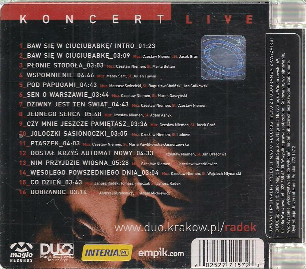 Zawiera: Zawiera: Baw się w ciuciubabkę / muz. Czesław Niemen , sł. Jacek Grań ; Płonie stodoła / muz. Czesław Niemen, sł. Marta Bellan ; Pod papugami / muz. Mateusz Święcicki, sł. Bogusław Choiński, Jan Gałkowski ; Wspomnienie / muz. Marek Sart , autor tekstu Julian Tuwim ; Nim przyjdzie wiosna / muz. Czesław Niemen, sł. Jarosław Iwaszkiewicz ; Czy mnie jeszcze pamiętasz / muz. Czesław Niemen, sł. Jacek Grań ; Dziwny jest ten świat / muz., sł. Czesław Niemen ; Jednego serca / muz. Czesław Niemen, sł. Adam Asnyk (oryginalny tytuł utworu: "Sonet") ; Jołoczki, sasionoczki / muz. Czesław Niemen, sł. ludowe ; Sen o Warszawie / muz. Czesław Niemen, sł. Marek Gaszyński ; Dostał Krzyś automat nowy (Pokój) / muz. Czesław Niemen, sł. Jan Brzechwa ; Wesołego powszedniego dnia (piosenka z filmu "Rodzina Leśniewskich") / muz. Czesław Niemen, sł. Wojciech Młynarski ; Co dzień / muz. Janusz Radek, Tomasz Filipczak, sł. Janusz Radek ; Dobranoc / muz. Andrzej Kurylewicz , sł. Adam Mickiewicz ; Ptaszek / muz. Czesław Niemen, sł. Maria Pawlikowska-Jasnorzewska.