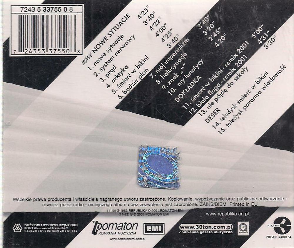 Zawiera: Zawiera: Nowe sytuacje (4:25) ; System nerwowy (3:40) ; Prąd (4:22) ; Arktyka (4:06) ; Śmierć w Bikini (4:22) ; Będzie plan (3:37) ; Mój imperlializm (3:38) ; Halucynacja (3;20) ; Znak "=" (2:48) ; My lunatycy (4:20). - Dokładka: 11. Śmierć w bikini (Remix 2001) 12. Biała flaga (Remix 2001) 13. Nie pójdę do szkoły - Teledyski- 14. Śmierć w bikini; 15. Poranna wiadomość.