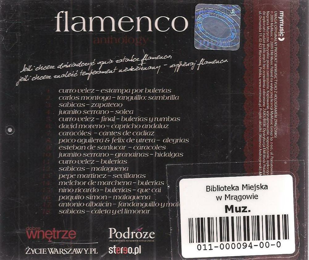 Flamenco : anthology / Curro Velez [et al.]. - Warszawa : Wydawnictwo EMI Music, copyright 2009. - 1 płyta audio (CD) : zapis cyfrowy, stereo ; 12 cm.