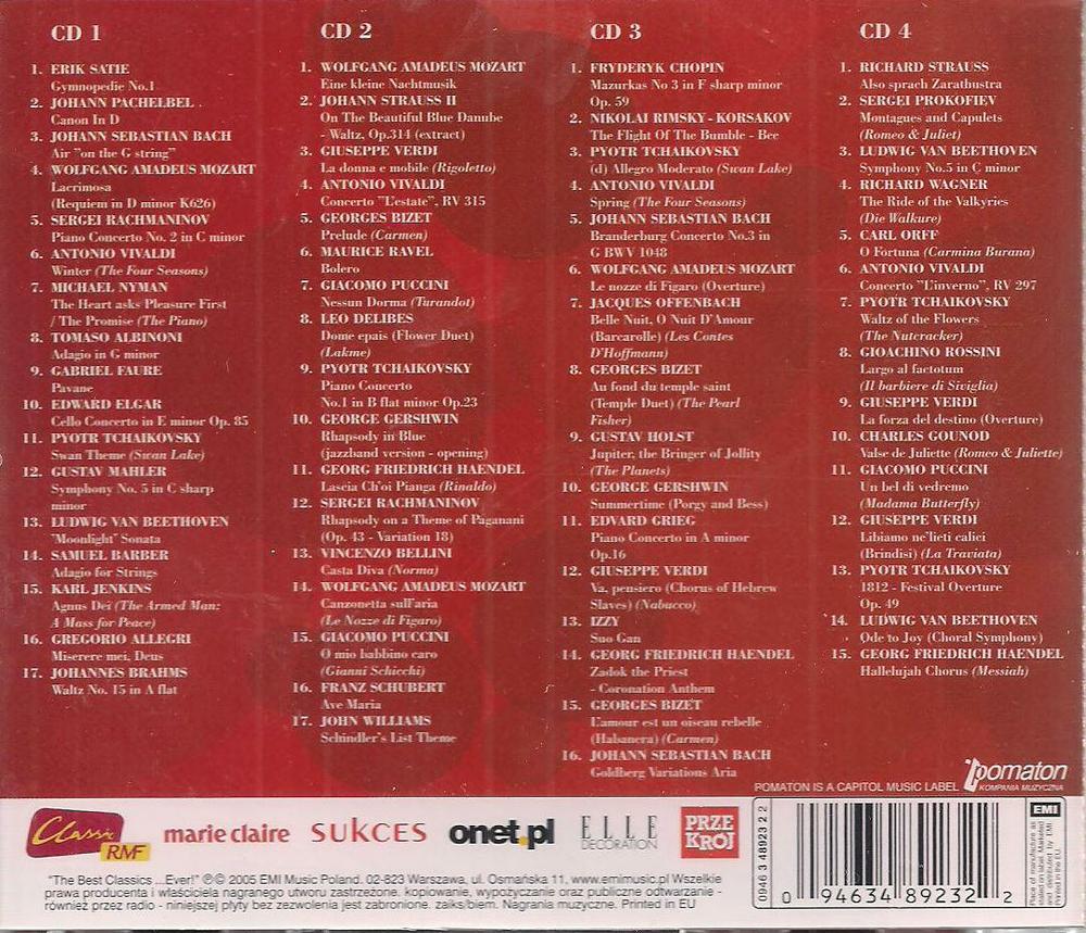 Zawiera: Zawiera: CD 1. Erik Satie: Gymnopedie No.1 ; Johann Pachelbel: Canon In D ; Johann Sebastian Bach: Air ĺOn The G Stringĺ. CD. 2: Wolfgang Amadeus Mozart: Eine Kleine Nachtmusik - I: Allegro ; Johann Strauss II: On The Beautiful Blue Danube - Waltz, Op.314 (Extract) ; Giuseppe Verdi: La Donna E Mobile (Rigoletto). CD. 3: Fryderyk Chopin: Mazurkas Op. 59: No 3 In F Sharp Minor ; Rimsky - Korsakov: The Flight Of The Bumble - Bee ; Pyotr Ilyich Tchaikovsky: (D) Allegro Moderato (Swan Lake). CD 4: Richard Strauss: Also Sprach Zarathustra ; Sergei Prokofiev: Montagues And Capulets (Romeo & Juliet) ; Ludwig Van Beethoven: Symphony No.5 In C Minor. CD 2: 1. Wolfgang Amadeus Mozart: Eine Kleine Nachtmusik - I: Allegro 2. Johann Strauss II: On The Beautiful Blue Danube - Waltz, Op.314 (Extract) 3. Giuseppe Verdi: La Donna E Mobile (Rigoletto) 4. Antonio Vivaldi: Concerto 'L'estate', RV 315 - III: Presto 5. Georges Bizet: Prelude (Carmen) 6. Maurice Ravel: Bolero (Conclusion) 7. Giacomo Puccini: Nessun Dorma (Turando, Act III) 8. Leo Delibes: Dome Epais (Flower Duet) (Lakme, Act I) 9. Pyotr Ilyich Tchaikovsky: Piano Concerto No.1 In B Flat Minor Op.23 I. Allegro Non Troppo E Molto Maestoso (Opening) 10. George Gershwin: Rhapsody In Blue (Jazzband Version - Opening) 11. George Frideric Handel: Lascia Chíoi Pianga (Rinaldo) (Arr. Craig Leon & Isobel Cooper) 12. Rachmaninov: Rhapsody On A Theme Of Paganani (Op. 43 - Variation 18) 13. Bellini: Casta Diva (Norma, Act I) 14. Wolfgang Amadeus Mozart: Canzonetta Sull'aria (Le Nozze Di Figaro, Act III) 15. Giacomo Puccini: O Mio Babbino Caro (Gianni Schicchi) 16. Franz Schubert: Ave Maria Maria Callas 17. John Williams: Schindler's List Theme .