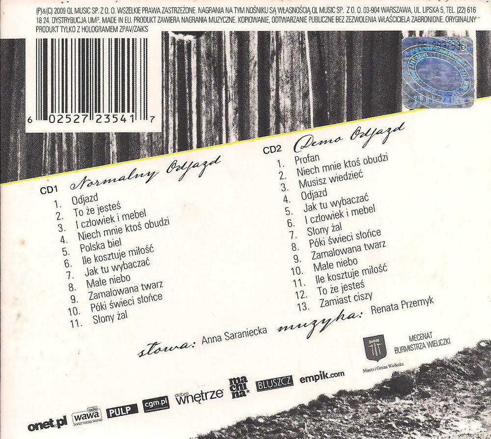 Zawiera: Zawiera: CD 1. Normalny odjazdn ; Odjazd ; To że jesteś ; I człowiek i mebel ; Niech mnie ktoś obudzi ; Polska biel ; Ile kosztuje miłośc ; Jak tu wybaczać ; Małe niebo ; Zamalowana twarz ; Póki słońce świeci ; Słony żal. Cd 2: Demo odjazd ; Profan ; Niech mnie ktoś obudzi ; Musisz wiedzieć ; Odjazd ; Jak tu wybaczać ; I człowiek i mebel ; Słony żal ; Póki świeci słońce ; Zamalowana twarz ; Małe niebo ; Ile kosztuje miłość ; To że jesteś ; Zamiast ciszy.