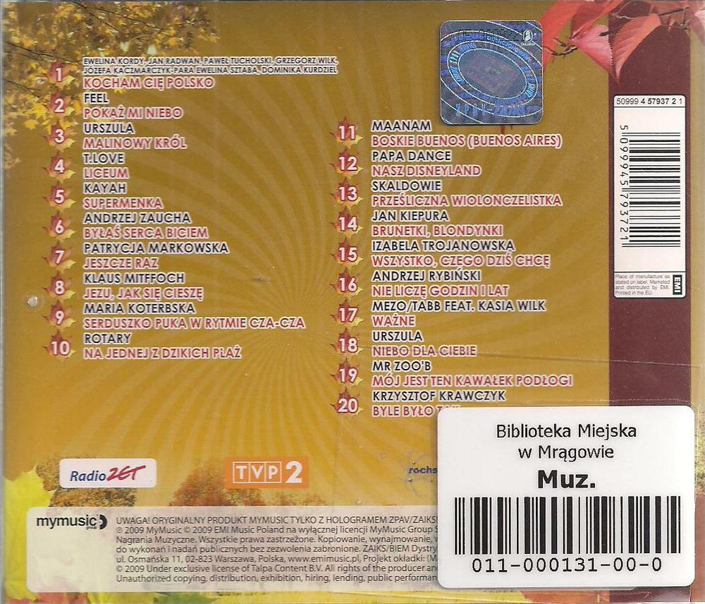 Zawiera: Zawiera: Ewelina Kordy, Jan Radwan, Paweł Tucholski, Grzegorz Wilk, Józefa Kaczmarczyk-Para, Ewelina Sztaba, Dominika Kurdziel - Kocham Cię Polsko ; Feel - Pokaż mi niebo ; Urszula - Malinowy król ; T.Love - Liceum ; Kayah - Supermenka ; Andrzej Zaucha - Byłaś serca biciem ; Patrycja Markowska - Jeszcze raz ; Klaus Mirffoch - Jezu, jak się cieszę ; Maria Koterbska - Serduszko puka w rytmie cza-cza ; Rotary - Na jednej z dzikich plaż ; Maanam - Boskie Buenos (Buenos Aires) ; Papa Dance - Nasz Disneyland ; Skaldowie - Prześliczna wiolonczelistka ; Jan Kiepura - Brunetki, blondynki ; Izabela Trojanowska - Wszystko, czego dziś chcę ; Andrzej Rybiński - Nie liczę godzin i lat ; Mezo / Tabb feat. Kasia Wilk - Ważne ; Urszula - Niebo dla ciebie ; Mr. Zoob - Mój jest ten kawałek podłogi ; Krzysztof Krawczyk - Byle było tak.