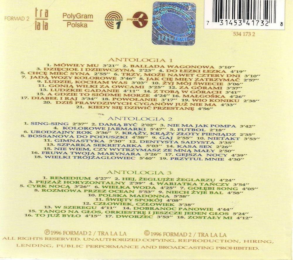 Zawiera: Zawiera: CD 3. Remedium - muz. Seweryn Krajewski , sł. Magda Czapińska ; Hej, żeglujże żeglarzu - muz. Jan Kanty Pawluśkiewicz ; Pejzaż horyzontalny -muz. Jan Kanty Pawluśkiewicz, sł. Wiesław Dymny ; Wariatka tańczy - muz. Seweryn Krajewski , sł. Agnieszka Osiecka ; Cyrk nocą - muz. Jacek Mikuła , sł. Agnieszka Osiecka ; Wielka woda - muz. Katarzyna Gaertner, sł. Agnieszka Osiecka ; Gołębi song - muz. Seweryn Krajewski, sł. Jacek Cygan ; Rozmowa przez ocean - muz. i sł. Andrzej Sikorowski ; Niech żyje bal - muz. Seweryn Krajewski, sł. Agnieszka Osiecka ; Polska Madonna - muz. Andrzej Sikorowski , sł. Agnieszka Osiecka ; Święty spokój - muz. Seweryn Krajewski, sł. Magda Czapińska ; Człowiek, człowiek - muz. Ryszard Szeremeta, sł. Jan Wołek ; W szeregu - muz. Seweryn Krajewski, sł. Agnieszka Osiecka ; Dobranoc panowie - muz. Andrzej Zieliński, sł. Agnieszka Osiecka ; Tango na głos i orkiestrę - muz. i sł. Grzegorz Tomczak ; To już było - muz. i sł. Andrzej Sikorowski ; Dworzec - muz. Jacek Mikuła, sł. Jan Wołek ; Zostały mi - muz. Katarzyna Gaertner, sł. Andrzej Brzeski.