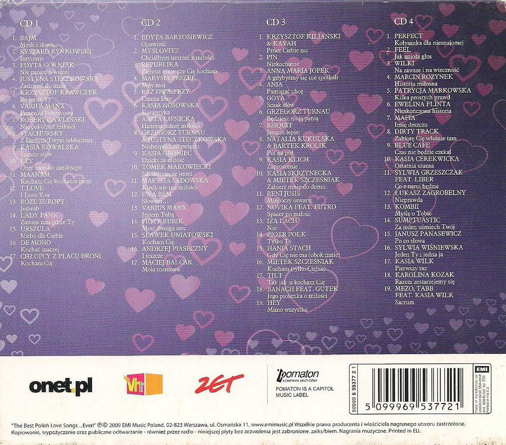 Zawiera: Zawiera: CD 3.: Prócz Ciebie nic (Krzysztof Kiljański feat. Kayah) ; Niekochanie (PIN) ; A gdybyśmy się nie spotkali (Anna Maria Jopek) ; Pamiętać chcę (Ania) ; Smak słów (Goya) ; Będziesz moją panią (Grzegorz Turnau) ; Jeszcze lepiej (Bisquit) ; Pół na pół (Natalia Kukulska feat. Bartek Królik) ; Zaproszenie (Kasia Klich) ; Zabierz mnie do domu (Kasia Skrzynecka feat. Mietek Szcześniak) ; Miej oczy otwarte (Reni Jusis) ; Spacer po miłość (Novika feat. Futro) ; Nie (Iza Lach) ; Tylko ty (Piotr Polk) ; Gdy cię nie ma (obok mnie) (Hania Stach) ; Kocham (tylko ciebie) (Mietek Szcześniak) ; Tak jak ja kocham cię (Tilt) ; Jego piosenka o miłości (Banach feat. Gutek) ; Mimo wszystko (Hey). CD 4.: Kołysanka dla nieznajomej (Perfect) ; Jak anioła głos (Feel) ; Na zawsze i na wieczność (Wilki) ; Historia miłosna (Marcin Rozynek) ; Kilka prostych prawd (Patrycja Markowska) ; Nieskończona historia (Ewelina Flinta) ; Imię deszczu (Mafia) ; Zabiorę cię właśnie tam (Dirty Track) ; Czas nie będzie czekał (Blue Cafe) ; Ostatnia szansa (Kasia Cerekwicka) ; Co z nami będzie (Sylwia Grzeszczak & Liber) ; Nieprawda (Łukasz Zagrobelny) ; Myślę o tobie (Kombii) ; Za jeden uśmiech Twój (Sumptuastic) ; Po co słowa (Janusz Panasewicz) ; Jeden ty i jedna ja (Sylwia Wiśniewska) ; Pierwszy raz (Kasia Wilk) ; Razem zestarzejemy się (Karolina Kozak).