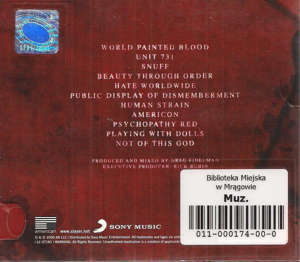 Zawiera: Zawiera: World Painted Blood ; Unit 731 ; Snuff ; Beauty Through Order ; Hate Worldwide ; Public Display of Dismemberment ; Human Strain ; Americon ; Psychopathy Red ; Playing with Dolls ; Not of This God.