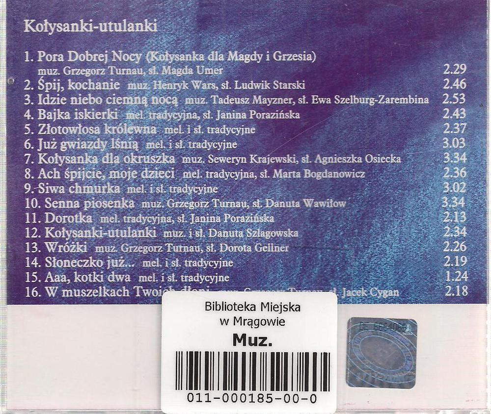 Kołysanki-utulanki / Magda Umer, Grzegorz Turnau. - [B.m.] : Wydawnictwo Fokus, 2003. - 1 płyta audio (CD) : zapis cyfrowy, stereo ; 12 cm.