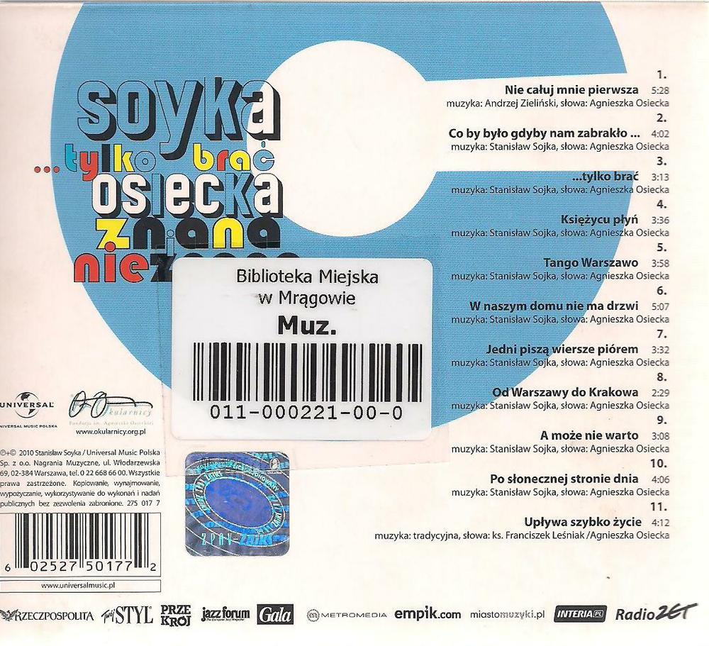 ...Tylko brać : Osiecka znana i nieznana / Stanisław Soyka. - Warszawa : Universal Music Group, 2010. - 1 płyta audio (CD) : zapis cyfrowy, stereo ; 12 cm.