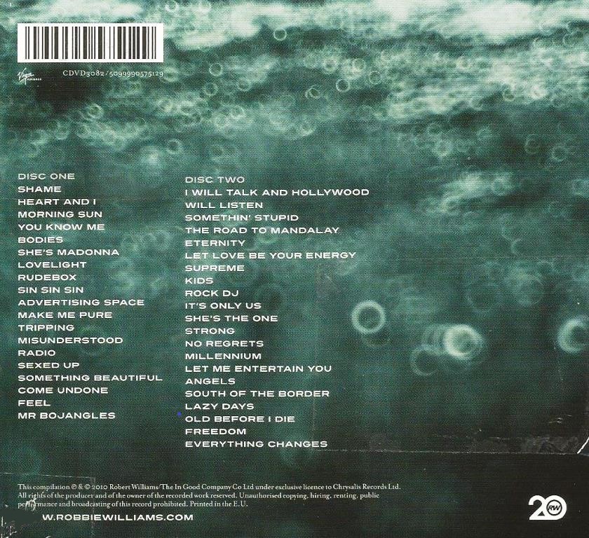 Zawiera: Zawiera CD 2.: I Will Talk and Hollywood Will Listen ; Somethin' Stupid (& Nicole Kidman) ; The Road to Mandalay ; Eternity ; Let Love Be Your Energy ; Supreme ; Kids (& Kylie Minogue) ; Rock DJ ; It's Only Us ; She's The One ; Strong ; No Regrets ; Millenium ; Let Me Entertain You ; Angels ; South of the Border ; Lazy Days ; Old Before I Die ; Freedom ; Everything Changes (& Take That).