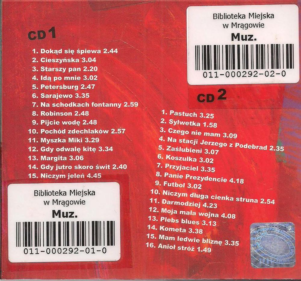 Zawiera: Zawiera CD 2: Pastuch (Aleksandra Muracka, Antoni Muracki, Jakub Muracki) ; Sylwetka (Paweł Orkisz) ; Czego nie mam (Elżbieta Wojnowska) ; Na stacji Jerzego z Podebrad (Zbigniew Zamachowsk) ; Zaślubieni (Antoni Muracki) Koszulka (Michał Łanuszka) ; Przyjaciel (Andrzej Sikorowski) ; Panie Prezydencie (polskie słowa na motywach oryginału "Pane Prezidente": Krzysztof Daukszewicz) (Krzysztof Daukszewicz) ; Futbol (Andrzej Ozga) ; Niczym długa cienka struna (Wacław Juszczyszyn i Wolna Grupa Bukowina) ; Darmodziej (Stanisław Sojka) ; Moja mała wojna (Antoni Muracki) ; Plebs blues (Mirosław Czyżykiewicz) ; Kometa (tł. Andrzej Ozga) (Stefan Brzozowski) ; Mam ledwie bliznę (Tadeusz Woźniak) ; Anioł stróż (Elżbieta Wojnowska).