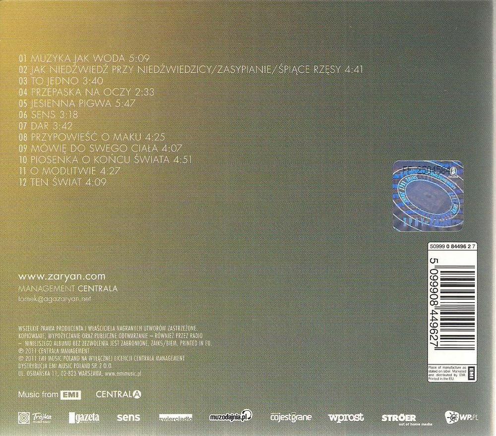 Zawiera: Zawiera: Muzyka jak woda ; Jak niedźwiedź przy niedźwiedzicy / Zasypianie / Śpiące rzęsy ; To jedno (duet z Grzegorze Turnauem) ; Przepaska na oczy ; Jesienna pigwa ; Sens ; Dar ; Przypowieść o maku ; Mówię do swego ciała ; Piosenka o końcu świata ; O modlitwie ; Ten świat.