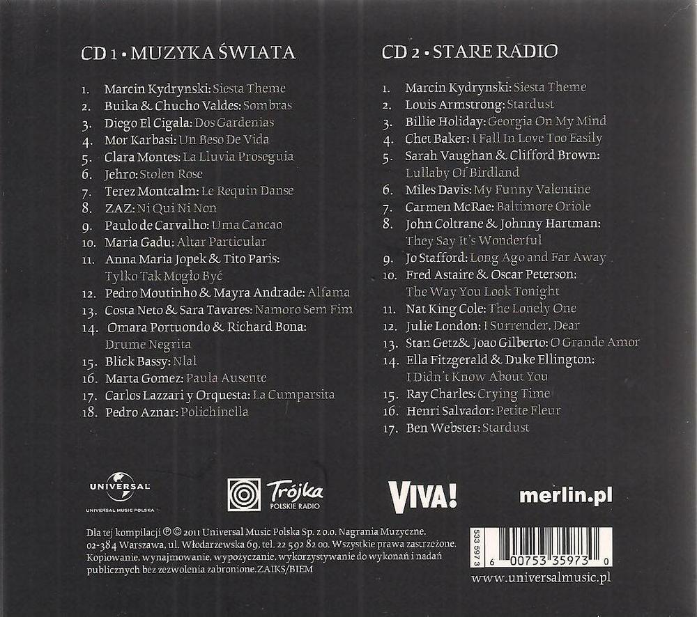 Zawiera: Zawiera: CD 2/ STARE RADIO: Marcin Kydrynski: Siesta Theme ; Louis Armstrong: Stardust ; Billie Holiday: Georgia On My Mind ; Chet Baker: I Fall In Love Too Easily ; Sarah Vaughan & Clifford Brown: Lullaby Of Birdland ; Miles Davis: My Funny Valentine ; Carmen McRae: Baltimore Oriole ; John Coltrane & Johnny Hartman: They Say Itĺs Wonderful ; Jo Stafford: Long Ago and Far Away ; Fred Astaire & Oscar Peterson: The Way You Look Tonight ; Julie London: I Surrender, Dear ; Stan Getz& Joao Gilberto: O Grande Amor ; Ella Fitzgerald & Duke Ellington: I Didnĺt Know About You ; Ray Charles: Crying Time ; Henri Salvador: Petite Fleur ; Ben Webster: Stardust.
