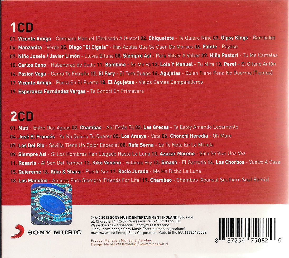Zawiera: Zawiera: Vicente Amigo - Compare Manuel (Dedicado A Queco) ; Chiquetete - Te Quiero Nina ; Gipsy Kings - Bamboleo; Manzanita - Verde ; Diego "El Cigala" - Hay Azules Que Se Caen De Moraos ; Falete - Payaso ; Nino Josele / Javier Limon - Lluvia Gitana ; Siempre Asi - Para Volver A Volver (Para Volver A Volver) ; Nina Pastori - Tu Me Camelas ; Carlos Cano - Habaneras De Cadiz ; Bambino - Se Me Va ; Lole Y Manuel - Tu Mira ; Peret - El Gitano Anton ; Pasion Vega - Como Te Extrano; El Fary - El Toro Guapo; nAgujetas - Quien Tiene Pena No Duerme (Tientos) ; Vicente Amigo - Poeta En El Puerto ; El Agujetas - Viejos Cantes Campanilleros ; Esperanza Fernandez Vargas - Te Conoci En Primavera. CD 2 - Mati - Entre Dos Aguas; Chambao - Ahi Estas Tu ; Las Grecas - Te Estoy Amando Locamente ; Jose El Frances - Ya No Quiero Tu Querer ; Los Amaya - Vete ; Chonchi Heredia - Oh Mare ; Los Del Rio - Sevilla Tiene Un Color Especial ; Rafa Serna - Se Te Nota En La Mirada ; Siempre Asi - Si Los Hombres Han Llegado Hasta La Luna ; Azucar Moreno - Solo Se Vive Una Vez ; Rosario - Al Son Del Tambor ; Kiko Veneno - Volando Voy ; Smash - El Garrotin ; Los Chorbos - Vuelvo A Casa ; Quiereme ; Kiko & Shara - Puede Ser ; Rocio Jurado - Me Ha Dicho La Luna ; Los Manolos - Amigos Para Siempre (Friends For Life) ; Chambao - Chambao (Xpansul Southern Soul Remix).