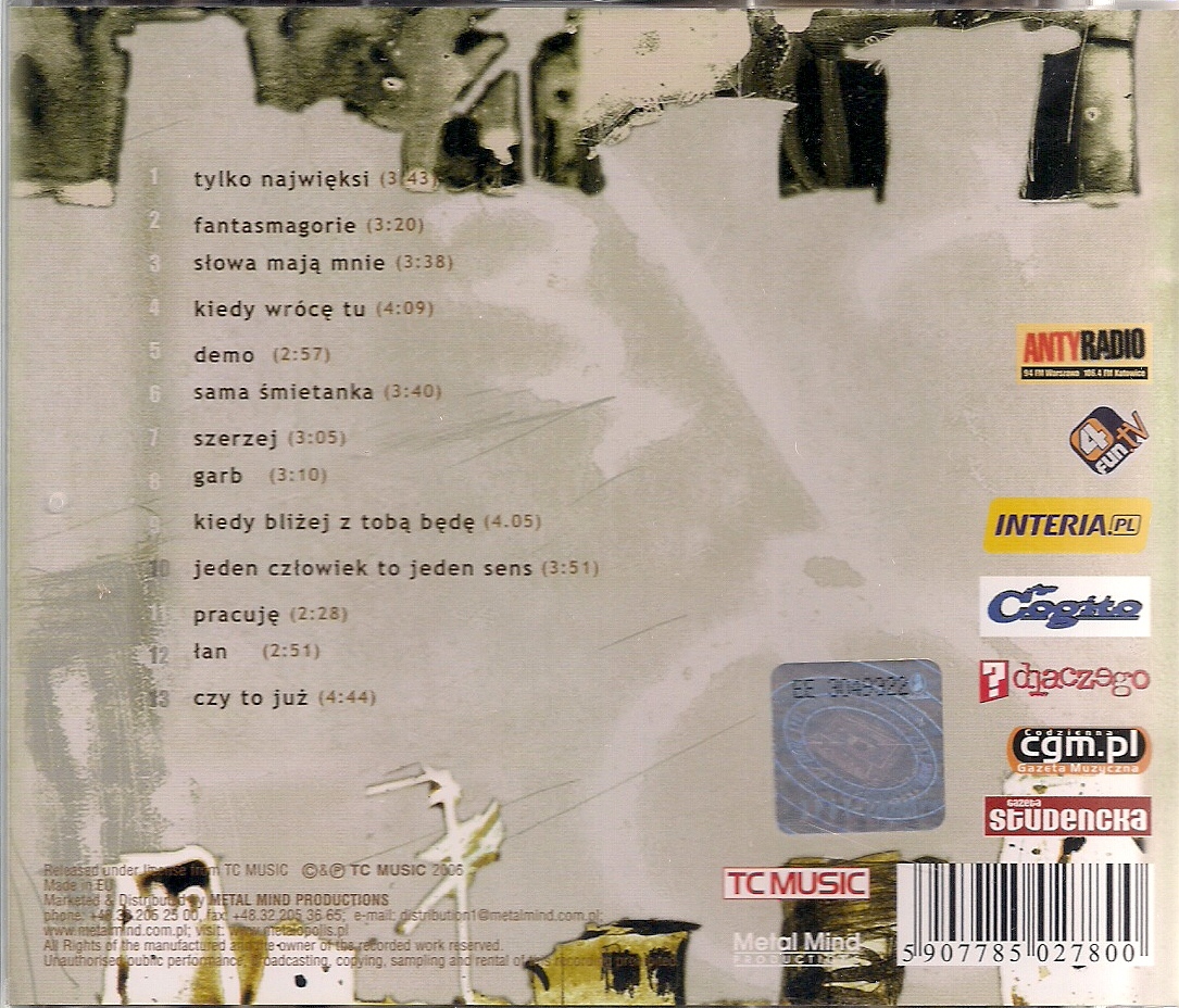 Zawiera: Zawiera: Tylko najwięksi ; Fantasmagorie ; Słowa mają mnie ; Kiedy wrócę tu ; Demo ; Sama śmietanka ; Szerzej ; Garb ; Kiedy bliżej z tobą będę ; Jeden człowiek to jeden sens ; Pracuję ; Łan ; Czy to już.