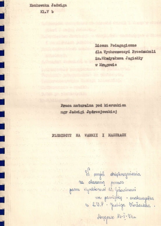 Praca maturalna pod kierunkiem Jadwigi Jedrzejewskiej. Liceum Pedagogiczne dla Wychowawczyń Przedszkoli im. Władysława Jagiełly w Mrągowie.