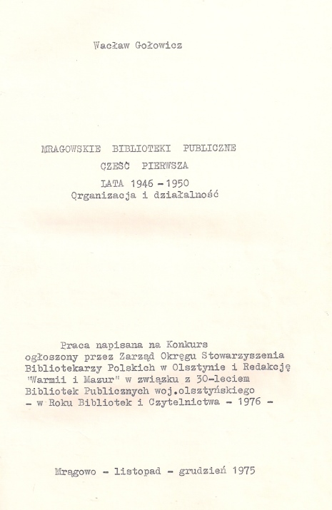 Praca napisana na Konkurs ogłoszony przez Zarząd Okręgu Stowaryzszenia Bibliotekarzy Polskich w Olsztynie i Redakcję "Warmii i Mazur" w związku z 30-leciem Bibliotek Publicznych woj. olsztyńskiego - w Roku Bibliotek i Czytelnictwa - 1976.