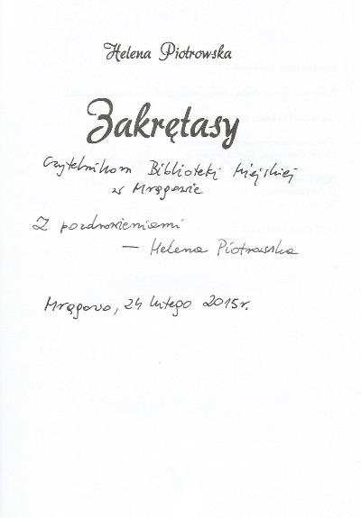Helena Piotrowska - ZAKRĘTASY : DZIEJE MIESZKAŃCÓW GURKELN - GÓRKŁA Jest to monografia wsi obecnie Gókło, w której w 1944 roku znalazła się matka autorki, a ona sama spędziła wczesne bardzo dzieciństwo. To też opowieść o tragicznej zimie 1945 roku, opowieść o losach mieszkańców małego skrawka Prus Wschodnich , ucieczce z tych ziem ludności niemieckiej, o poczynaniach Armii Czerwonej i narastających konfliktach narodowościowych na Warmii i Mazurach w czasach powojennych. Autorka swą uwagę ,skupia tylko na jednej niewielkiej miejscowości , zwanej do 1945 roku Gurkeln, a po wojnie, po przyłączeniu tych ziem do Polski - Górkło, ale przeżycia ich mieszkańców są charakterystyczne dla zawiłości losu regionu.