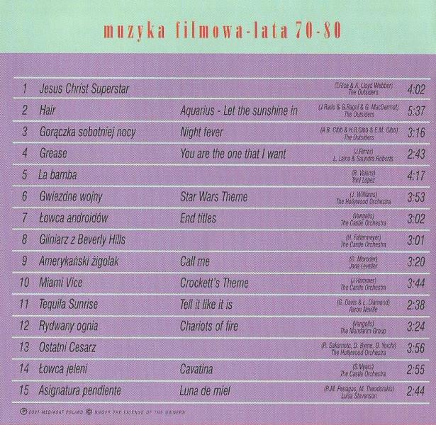 Zawiera: Zawiera: CD. 2. Jesus Christ Superstar / muz. Andrew Lloyd Webber ; The Outsiders (4:02 min.) ; Hair : Aquarius - Let The Sunshine In / muz. Galt MacDermot ; The Outsiders (5:37 min.) ; Gorączka sobotniej nocy : Night Fever / muz. Barry Gibb, Robin Gibb, Maurice Gibb, David Shire ; The Outsiders (3:16 min.); Grease : You Are The One That I Want / muz. Barry Gibb ; L. Laina, Saundra Roberts (2:43 min.) ; La Bamba / muz. Ritchie Valens ; Trini Lopez (4:17 min.) ; Gwiezdne wojny : Stars Wars Theme / muz. John Williams ; The Hollywood Orchestra (3:53 min.) ; Łowca androidów : End Titles / muz. Vangelis ; The Castle Orchestra (3:02 min.) ; Gliniarz z Beverly Hills / muz. H. Faltermeyer ; The Castle Orchestra (3:01 min.) ; Amerykański żigolak : Call Me / muz. Giorgio Moroder ; Jana Leveller (3:20 min.) ; Miami Vice : Crockett's Theme / muz. Jan Hammer ; The Castle Orchestra (3:44 min.) ; Tequila Sunrise : Tell It Like It Is / muz. Dave Grusin ; Aaron Neville (2:38 min.) ; Rydwany ognia : Chariots Of Fire / muz. Vangelis ; The Mandarin Group (3:24 min.) ; Ostatni cesarz / muz. Ryuichi Sakamoto, David Byrne ; The Hollywood Orchestra (3:56 min.); Łowca jeleni : Cavatina / muz. Stanley Myers ; The Castle Orchestra (2:55 min.) ; Asignatura pendiente : Luna de miel / muz. R.M. Penagos, M. Theodorakis ; Luisa Stevenson (2:44 min.).