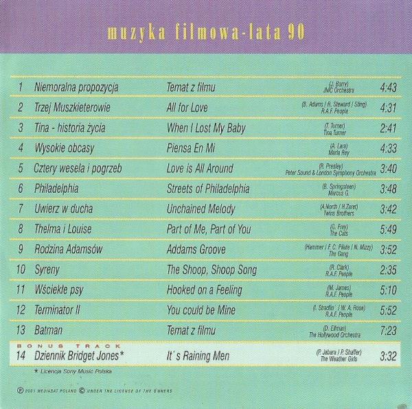 Zawiera: Zawiera: CD. 3. Niemoralna propozycja : Temat z filmu / muz. John Barry ; JMC Orchestra (4:43 min.) ; Trzej Muszkieterowie : All For Love / muz. Michael Kamen ; R.A.F.People (4:31 min.); Tina - historia życia : When I Lost My Baby / Tina Turner (2:41 min.) ; Wysokie obcasy : Piensa En Mi / muz. Ryuichi Sakamoto ; Maria Rey (4:33 min.) ; Cztery wesela i pogrzeb : Love Is All Around / muz. Richard Rodney ; Peter Sound, London Symphony Orchestra (3:40 min.) ; Philadelphia : Streets Of Philadelphia / muz. Bruce Springsteen ; Marcus G. (3:48 min.) ; Uwierz w ducha : Unchained Melody / muz. Maurice Jarre ; Twins Brothers (3:42 min.) ; Thelma i Louise : Part Of Me, Part Of You / muz. Hans Zimmer ; The Cats (5:49 min.) ; Rodzina Adamsów : Addams Groove / muz. Marc Shaiman ; The Gang (3:52 min.) ; Syreny : The Shoop, Shoop Song / muz. Jack Nitzsche ; R. A. F. People (2:35 min.) ; Wściekłe psy : Hooked On A Feeling / muz. Karyn Rachtman ; R.A.F.People (5:10 min.) ; Terminator II : You Could Be Mine / muz. Brad Fiedel ; R.A.F.People (5:52 min.) ; Batman : Temat z filmu / muz. Danny Elfman ; The Hollywood Orchestra (7:23 min.) ; Dziennik Bridget Jones : It's Raining Men / muz. Patrick Doyle ; The Weather Girls (3:32 min.).