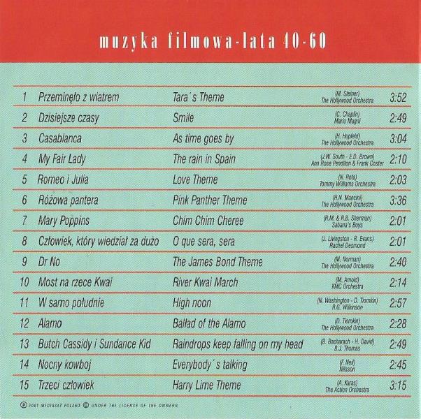 Zawiera: Zawiera: CD. 1. Przeminęło z wiatrem : Tara's Theme / muz. Max Steiner ; The Hollywood Orchestra (3:52 min.); Dzisiejsze czasy : Smile / muz. Charles Chaplin ; Mario Magni (2:49 min.); Casablanca : As Time Goes By / muz. Max Steiner ; The Hollywood Orchestra (3:04 min.); My Fair Lady : The Rain In Spain / muz. Frederick Loewe ; Ann Rose Pendlton, Frank Coster (2:10 min.); Romeo i Julia : Love Theme / muz. Nino Rota ; Tommy Williams Orchestra (2:03 min.); Różowa Pantera : Pink Panther Theme / muz. Henry Mancini ; The Hollywood Orchestra (3:36 min.); Mary Poppins : Chim Chim Cheree / muz. Richard Sherman, Robert B. Sherman ; Sabana's Boys (2:01 min.); Człowiek, który wiedział za dużo : O Que Sera, Sera / muz. Jay Livingston, Ray Evans ; Rachel Desmond (2:01 min.); Dr No : The James Bond Theme / muz. Monty Norman ; The Hollywood Orchestra (2:40 min.); Most na rzece Kwai : River Kwai March / muz. Malcolm Arnold ; KMC Orchestra (2:14 min.); W samo południe : High Noon / muz. Dimitri Tiomkin ; R.G. Wilkinson (2:57 min.); Alamo : Ballad Of The Alamo / muz. Dimitri Tiomkin ; The Hollywood Orchestra (2:28 min.); Butch Cassidy i Sundance Kid : Raindrops Keep Falling On My Head / muz. Burt Bacharach ; B.J. Thomas (2:49 min.); Nocny kowboj : Everybody's Talking / muz. John Barry ; Nilsson (2:45 min.); Trzeci człowiek : Harry Lime Theme / muz. Anton Karas ; The Action Orchestra (3:15 min.).