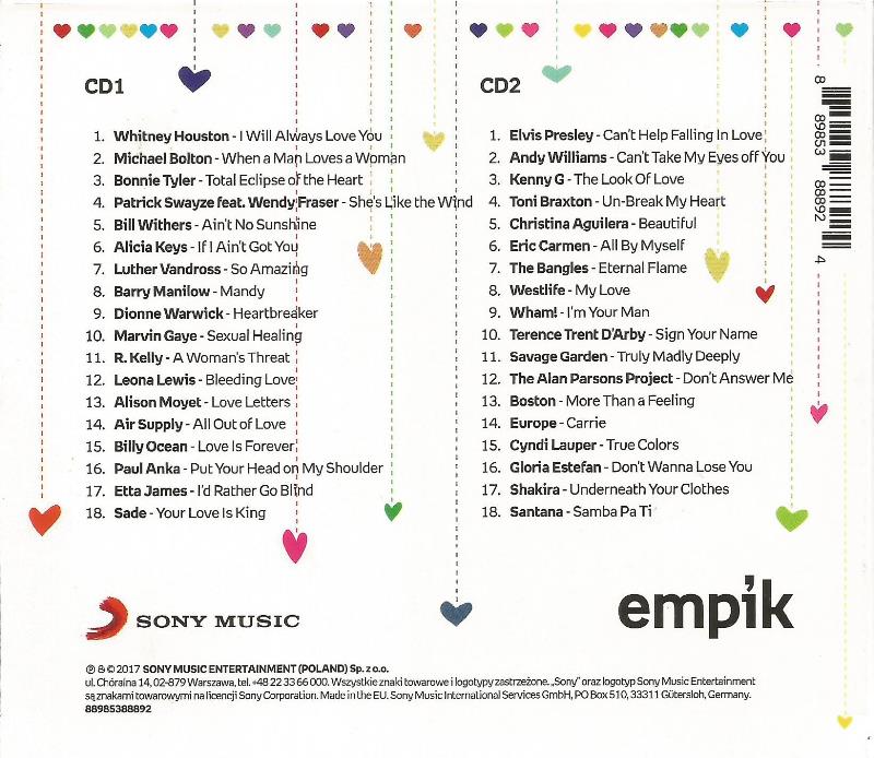 Zawiera: Zawiera: CD 2. Elvis Presley - Can't Help Falling In Love ; Andy Williams - Can't Take My Eyes off You ; Kenny G - The Look Of Love ; Toni Braxton - Un-Break My Heart ; Christina Aguilera - Beautiful ; Eric Carmen - All By Myself ; The Bangles - Eternal Flame ; Westlife - My Love ; Wham! - I'm Your Man ; Terence Trent D'Arby - Sign Your Name ; Savage Garden - Truly Madly Deeply ; The Alan Parsons Project - Don't Answer Me ; Boston - More Than a Feeling ; Europe - Carrie ; Cyndi Lauper - True Colors ; Gloria Estefan - Don't Wanna Lose You ; Shakira - Underneath Your Clothes ; Santana - Samba Pa Ti.