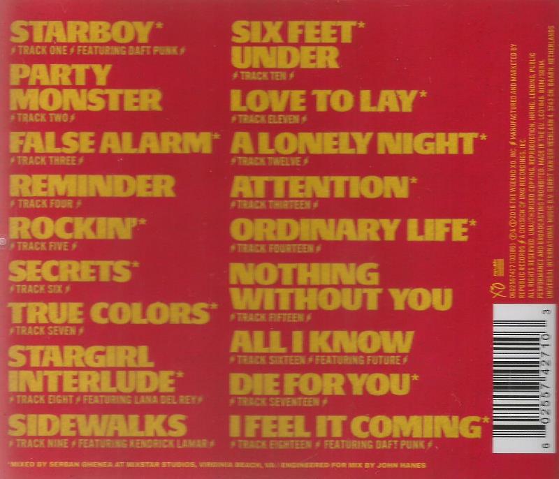 Zawiera: Zawiera: Starboy ; Party monster ; False alarm ; Reminder ; Rockin' ; Secrets. True colors ; Stargirl interlude ; Side walks ; Six feet under ; Love to lay ; A lonely night ; Attention ; Ordinary life ; Nothing without you ; All I know ; Die for you ; I feel it coming.