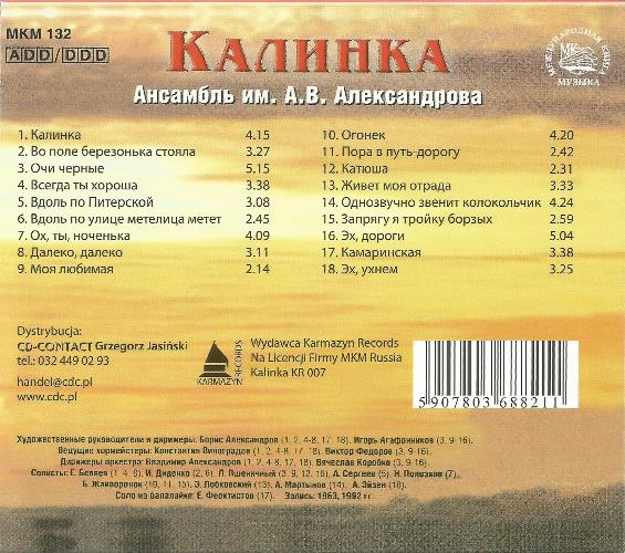 Zawiera: Zawiera: Kalinka ; Wo polie bierezońka stojała ; Oczi cziornyje ; Wsiegda Ty horosha ; Wdol po Piterskoj ; Wdol po ulice metelica mietiot ; Och ty noczeńka ; Daleko,daleko ; Moja lubimaja ; Ogoniok ; Pora w puć dorogu ; Katiusza ; Żywiot moja otrada ; Odnozwuczno zwonit kołokolczik ; Zapriagu ja trojku borzyh ; Ech dorogi ; Kamarinskaja ; Ech uchniom.