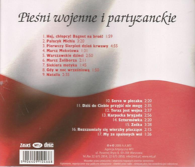 Pieśni wojenne i partyzanckie. - Warszawa : Agencja Artystyczna MTJ, 2006. - 1 płyta audio (CD) (39 min 03 s) : zapis cyfrowy, stereo ; 12 cm + Dod. druk. : [2] s.