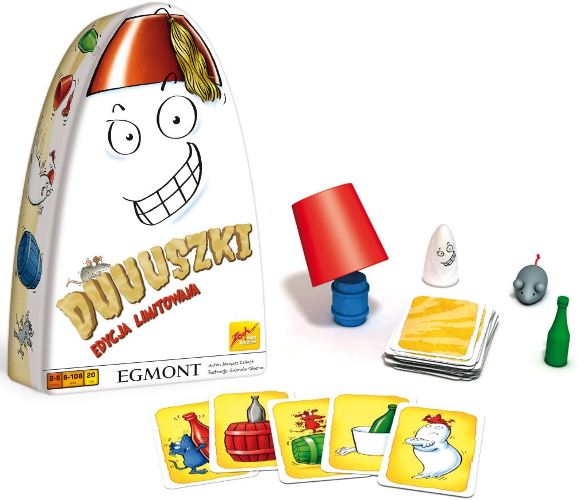 W gry serii „Duuuszki” można grać niezależnie albo połączyć dwie lub nawet trzy gry i otrzymać SUPERWERSJĘ! Proste zasady i możliwość przeprowadzenia rozgrywki jednocześnie przez 8 graczy, to ponownie ogromna zaleta tej imprezowej gry. Na stole znajduje się 5 przedmiotów w 5 kolorach. Jeden z graczy szybko wykłada kolejne karty, z których każda przedstawia dwa z tych przedmiotów. Czasami jeden z przedmiotów ma właściwy kształt i kolor i wówczas należy jak najszybciej złapać właśnie tę rzecz. Niemniej zdarzają się karty, na których na pierwszy rzut oka wszystko jest na opak - żaden z dwóch przedmiotów nie jest we właściwym kolorze. Co wtedy? Wówczas należy złapać ten z przedmiotów, którego na danej karcie nie ma. Nie występuje na niej ani pod względem kształtu, a ni pod względem koloru. I choć brzmi to strasznie skomplikowanie, to zawsze jest tylko jedna prawidłowa odpowiedz i tylko jedną rzecz należy złapać. Gracz, który będzie najszybszy, zdobywa kartę. Za błędy znowu trzeba zapłacić - oddać jedną z wcześniej zdobytych kart. Wygrywa osoba, która zgromadzi najwięcej kart. [www.egmont.pl]