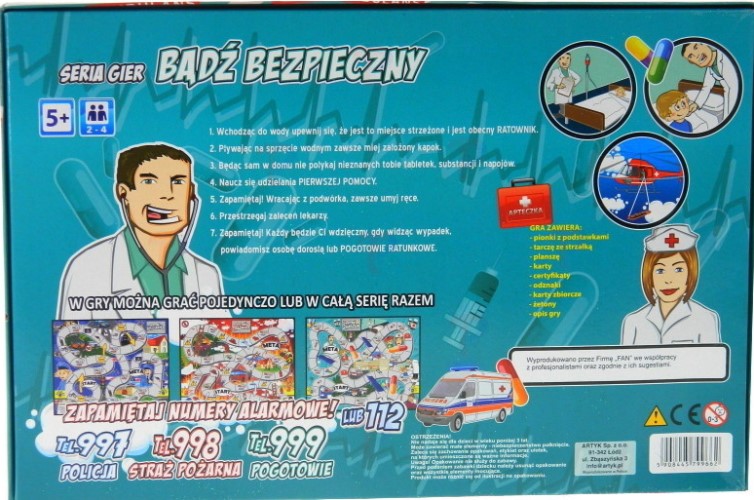 Zostań lekarzem, który ratuje życie ludzi, przeprowadza skomplikowane operacje, leczy i dba o nasze zdrowie. Włóż lekarski kitel i rozpocznij niezwykłą przygodę... Jako lekarz musisz posiadać wiele umiejętności: znać anatomię, zasady higieny, mieć rozległą wiedzę, potrafić udzielić pierwszej pomocy poszkodowanym. Czy jesteś gotowy? Wskakuj do karetki i ruszaj na ratunek ludzkiego życia! Rozłóż planszę i rozpocznij. Uzupełnij kartę zbiorczą lekarza, jako pierwszy dojdź do mety i wygraj! W serii trzy gry: Zostań strażakiem, Zostań policjantem, Zostań lekarzem. W gry można grać pojedynczo lub w całą serię razem. Zbierz je wszystkie!