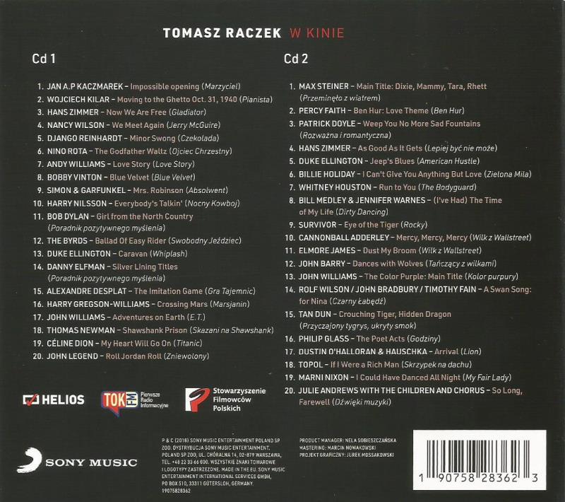 Zawiera: CD1: Impossible opening / Jan A.P. Kaczmarek (Marzyciel) ; Moving To The Ghetto / Wojciech Kilar (Pianista) ; Now we are free / Hans Zimmer (Gladiator) ; We meet again / Nancy Wilson (Jerry McGuire) ; Minor swong / Django Reinhardt (Czekolada) ; The Godfather waltz / Nino Rota (Ojciec chrzestny) ; Love Story / Andy Williams (Love Story) ; Blue Velvet / Bobby Vinton (Blue Velvet) ; Mrs Robinson / Simon & Garfunkel (Absolwent) ; Everybody's Talkin' / Harry Nilsson (Nocny Kowboj) ; Girl From The North Country / Bob Dylan (Poradnik Pozytywnego Myślenia) ; Ballad Of Easy Rider / The Byrds (Swobodny Jeździec) ; Caravan / Duke Ellington (Whiplash) ; Silver Lining Titles / Danny Elfman (Poradnik Pozytywnego Myślenia) ; The Imitation Game / Alexandre Desplat (Gra Tajemnic) ; Crossing Mars / Harry Gregson-Williams (Marsjanin) ; Adventures On Earth / John Williams (E. T.) ; Shawshank Prison / Thomas Newman (Skazani na Shawshank) ; My Heart Will Go On / Celine Dion (Titanic) ; Roll Jordan Roll / John Legend (Zniewolony).