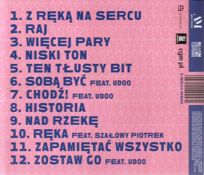 Zawiera: Zawiera: Z ręką na sercu ; Raj ; Więcej pary ; Niski ton ; Ten tłusty bit ; Sobą być (feat Udoo) ; Chodź! (feat. Udoo) ; Historia ; Nad rzekę ; Ręka (feat. Szałowy Piotrek) ; Zapamietać wszystko ; Zostaw Go (feat. Udoo).