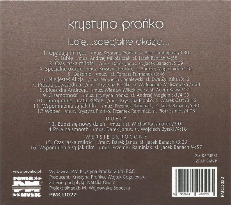 Lubię…specjalne okazje… / Krystyna Prońko. - Warszawa : e-Muzyka, 2018. - 1 płyta audio (CD) : zapis cyfrowy, stereo ; 12 cm.