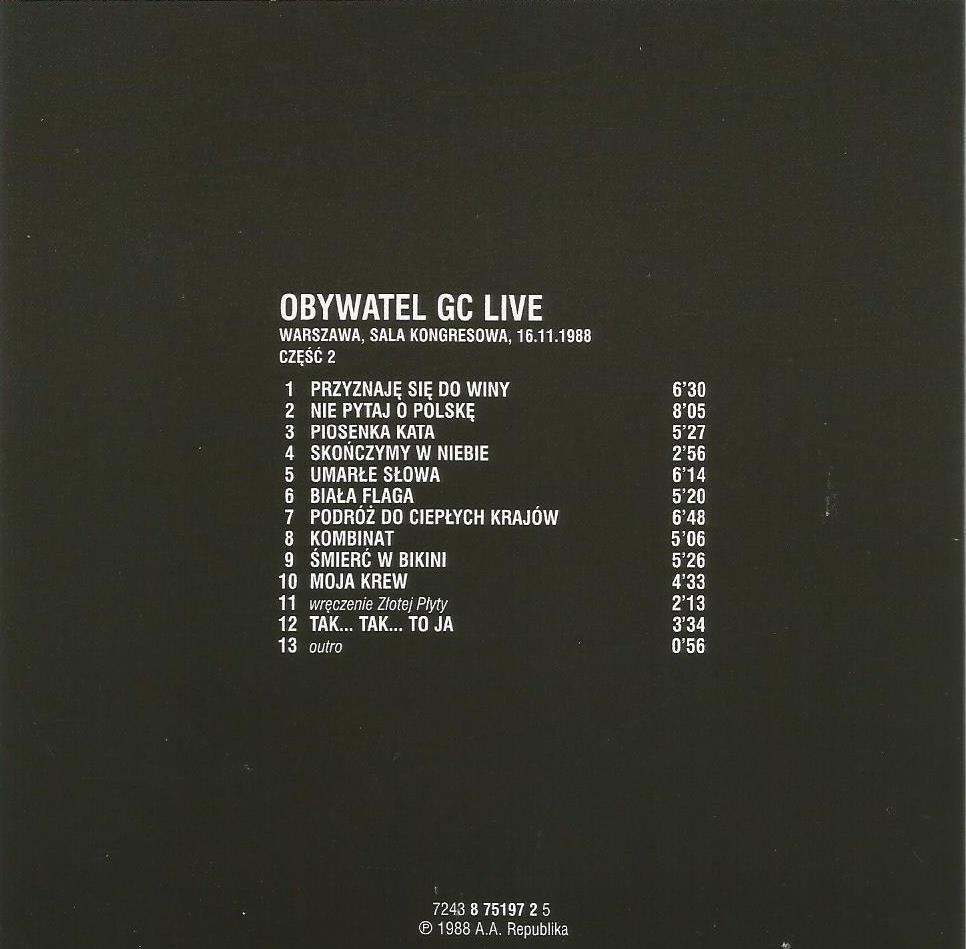 Obywatel G.C. live. Cz. 2 / [słowa, muzyka, wykonanie Grzegorz Ciechowski]. - Warszawa : EMI Music Poland ; Pomaton, [2011]. - 1 płyta audio (CD) (62 min 58 s) : zapis cyfrowy, stereo ; 12 cm.