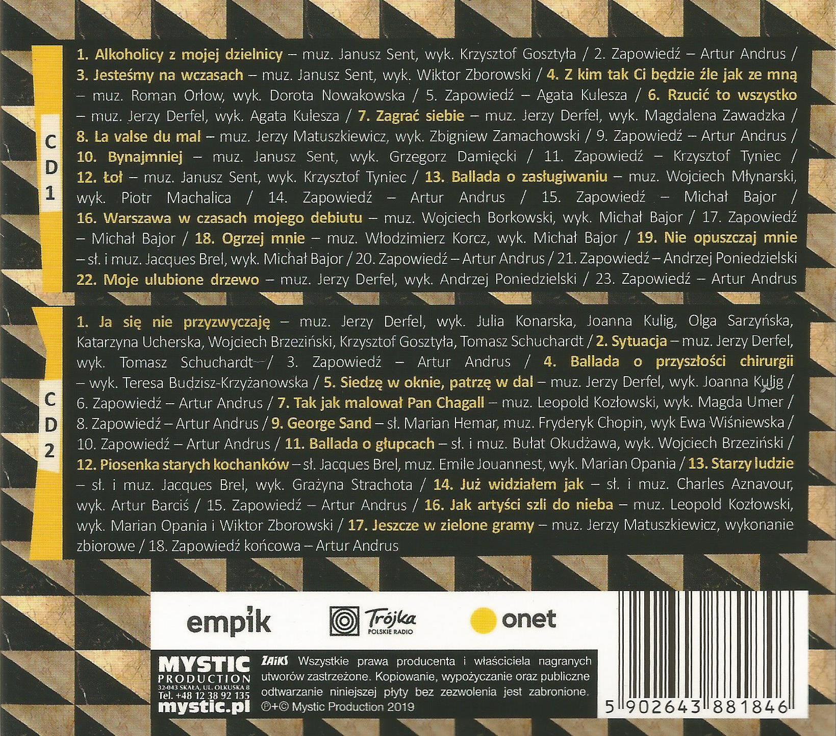 Zawiera: Zawiera CD 1: Alkoholicy z mojej dzielnicy – muz. Janusz Sent, wyk. Krzysztof Gosztyła ; Zapowiedź – Artur Andrus ; Jesteśmy na wczasach – muz. Janusz Sent, wyk. Wiktor Zborowski ; Z kim tak Ci będzie źle jak ze mną – muz. Roman Orłow, wyk. Dorota Nowakowska ; Zapowiedź – Agata Kulesza ; Rzucić to wszystko – muz. Jerzy Derfel, wyk. Agata Kulesza ; Zagrać siebie – muz. Jerzy Derfel, wyk. Magdalena Zawadzka ; La valse du mal – muz. Jerzy Matuszkiewicz, wyk. Zbigniew Zamachowski ; Zapowiedź – Artur Andrus ; Bynajmniej – muz. Janusz Sent, wyk. Grzegorz Damięcki ; Zapowiedź – Krzysztof Tyniec ; Łoł – muz. Janusz Sent, wyk. Krzysztof Tyniec ; Ballada o zasługiwaniu – muz. Wojciech Młynarski, wyk. Piotr Machalica ; Zapowiedź – Artur Andrus ; Zapowiedź – Michał Bajor ; Warszawa w czasach mojego debiutu – muz. Wojciech Borkowski, wyk. Michał Bajor ; Zapowiedź – Michał Bajor ; Ogrzej mnie – muz. Włodzimierz Korcz, wyk. Michał Bajor ; Nie opuszczaj mnie – sł. i muz. Jacques Brel, wyk. Michał Bajor ; Zapowiedź – Artur Andrus ; Zapowiedź – Andrzej Poniedzielski ; Moje ulubione drzewo – muz. Jerzy Derfel, wyk. Andrzej Poniedzielski ; Zapowiedź – Artur Andrus.