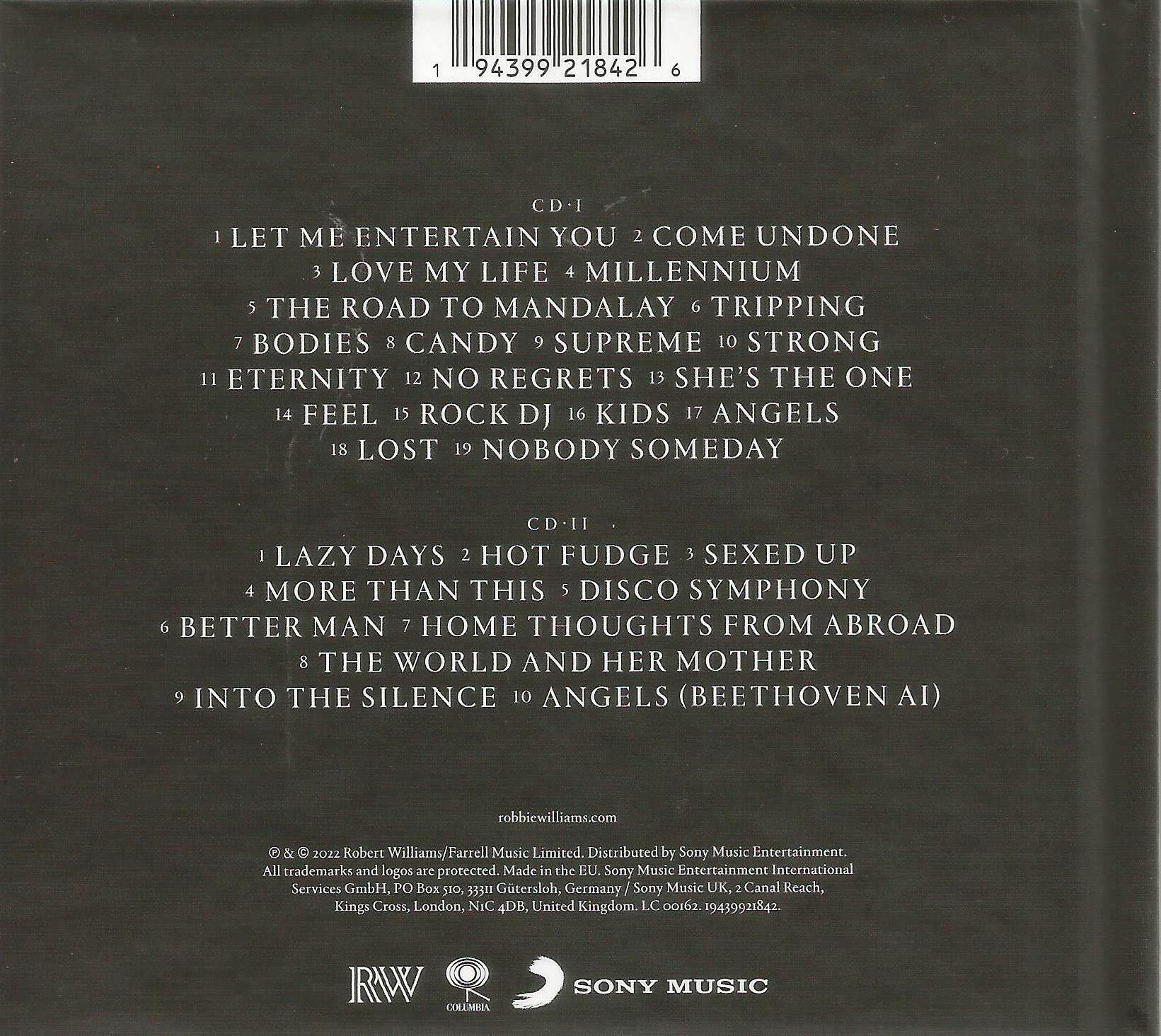 Zawiera: Zawiera: CD 1.: Let Me Entertain You ; Come Undone ; Love My Life ; Millennium ; The Road To Mandalay ; Tripping ; Bodies ; Candy ; Supreme ; Strong ; Eternity ; No Regrets ; She’s The One ; Feel ; Rock DJ ; Kids ; Angels ; Lost ; Nobody Someday.