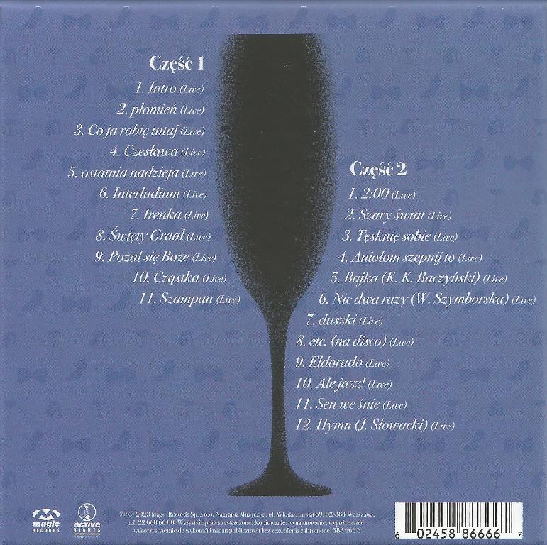 CD 2: 2:00 (Live) ; Szary świat (Live) ; Tęsknię sobie (Live) ; Aniołom szepnij to (Live) ; Bajka (K.K. Baczyński) (Live) ; Nic dwa razy (W. Szymborska) (Live) ; duszki (Live) ; etc. (na disco) (Live) ; Eldorado (Live) ; Ale jazz! (Live) ; Sen we śnie (Live) ; Hymn (J. Słowacki) (Live)