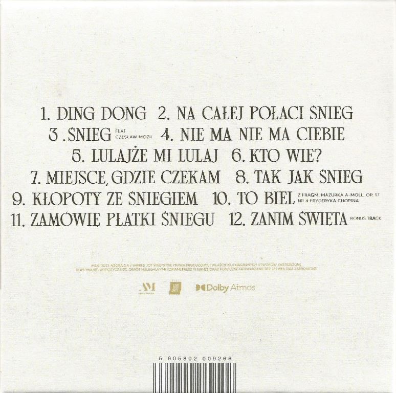 Zawiera: Ding dong ; Na całej połaci śnieg ; Śnieg (feat. Czesław Mozil) ; Nie ma nie ma ciebie ; Lulajże mi lulaj ; Kto wie? ; Miejsce, gdzie czekam ; Tak jak śnieg ; Kłopoty ze śniegiem ; To biel ; Zamówię płatki śniegu ; Zanim święta.
