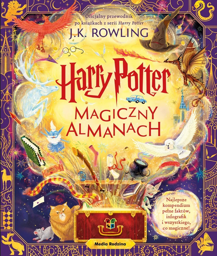 Pierwszy oficjalny przewodnik po książkach z serii „Harry Potter”! Najlepsze kompendium pełne faktów, infografik i wszystkiego, co magiczne! Przepięknie ilustrowany album dla całej rodziny – zarówno dla młodych czytelników, którzy wyruszają w swoją pierwszą, oszałamiającą podróż do Hogwartu, jak i dla ekspertów, którzy docenią rozmach i głębię informacji mniej oczywistych czy zapomnianych. Piękne wydanie w wielkim formacie i twardej oprawie, z rozkładanymi ilustracjami i wstążką do zaznaczania, zostało dodatkowo ozdobione złoconą folią. Magiczny almanach jest wartościowym prezentem, który posłuży wiele lat. Wiedza pochodząca z książek J.K. Rowling zaprezentowana została tu w formie map, wykresów i przekrojowych grafik ukazujących całą gamę magicznych osobliwości – od zaczarowanych obiektów, magicznego jedzenia, po fantastyczne rośliny i stworzenia. Podzielony na siedem rozdziałów Almanach to must-have dla każdego czytelnika. Pozwoli mu zgłębić informacje o ukochanych bohaterach, przeżyć na nowo ulubione sceny, zdobyć wiedzę o zaklęciach, poszukać ukrytych sekretów i oddać się fantazji, zwiedzając Szkołę Magii i Czarodziejstwa. Czytelnik znajdzie tu wszystko: od Tiary Przydziału po inkantacje zaklęć. „Magiczny almanach” zauroczy Cię od pierwszego wejrzenia i przywoła na nowo magiczny świat J.K. Rowling: świeży, unikalny, nieskończenie odkrywczy, a przy tym pełen fantazji i humoru. Oszołomi Cię ilością wiedzy i szczegółowością, rozczuli cytatami z książek – pamiętnymi kwestiami ukochanych postaci, zachwyci ilustratorskim rozmachem, a jednocześnie wiernym podejściem do magicznych miejsc, postaci, stworzeń i przedmiotów.