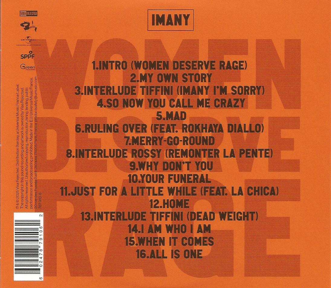 Zawiera: Intro (women deserve rage) ; My own story ; Interlude tiffini (Imany I'm sorry) ; So now you call me crazy ; Mad ; Ruling over (feat. Rokhaya Diallo) ; Merry-go-round ; Interlude rossy (remonter la pente) ; Why don't you ; Your funeral ; Just for a little while (feat. la chica) ; Home ; Interlude tiffini (dead weight) ; I am who I am ; When it comes ; All is one.
