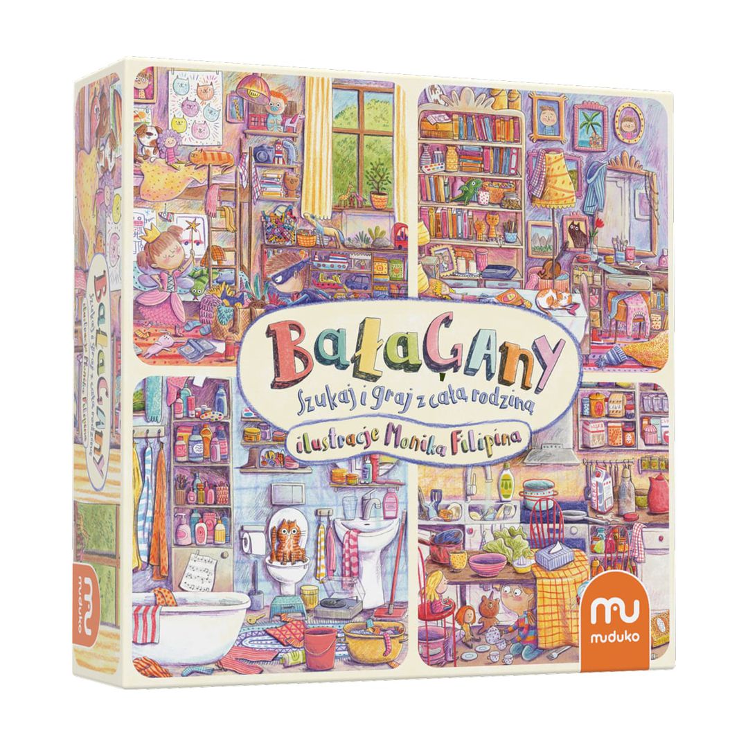 Bałagany : szukaj i graj z całą rodziną / [autorzy: Roksana Hibner, Michał Friedrich] ; ilustracje: Monika Filipina. - Podłęże : Muduko, © 2024. - 1 pudełko : tektura, plastik, kolor ; w pudełku 8x24x24 cm + instrukcja ([8] stron : ilustracje ; 22 cm).